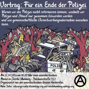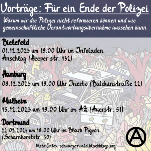 Schwarzer Wald ist eine neues anarchistisches Projekt in Bochum/dem Ruhrgebiet. Das Projekt ist als lokales/regionales Projekt gedacht. Mit Vorträgen und Workshops soll es aber hinaus in die ganze (deutschprachige) Welt gehen. Mehr dazu in welches Richtung es gehen soll: